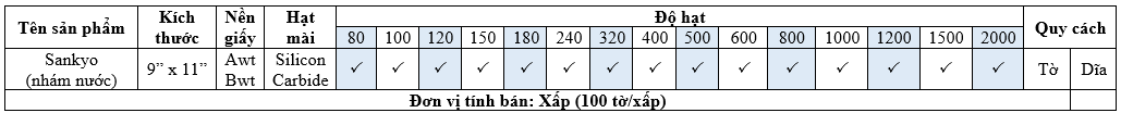 Giấy nhám tờ Sankyo được cấu tạo từ các hạt cát và được sắp xếp một cách phù hợp trên một mặt giấy cùng công nghệ tiên tiến từ Nhật Bản cho chất lương vượt trội có độ bền cao và có thể chịu được lực chà nhám mạnh và có thể giúp tạo ra bề mặt mịn hơn. Giấy nhám Sankyo có nhiều loại độ hạt khác nhau, đáp ứng được nhiều nhu cầu sử dụng.